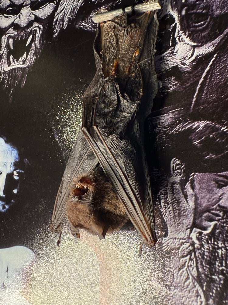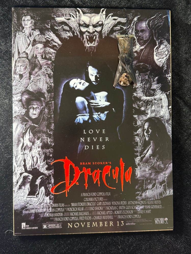 ✨The original story of love, lust and blood! Starting some of the biggest names in film, this movie will live on as one of the most classic vampire films. Paired with a real preserved Microbat hanging from a wooden perch, nothing screams Dracula like bats! Enclosed within an A4 black box frame.