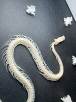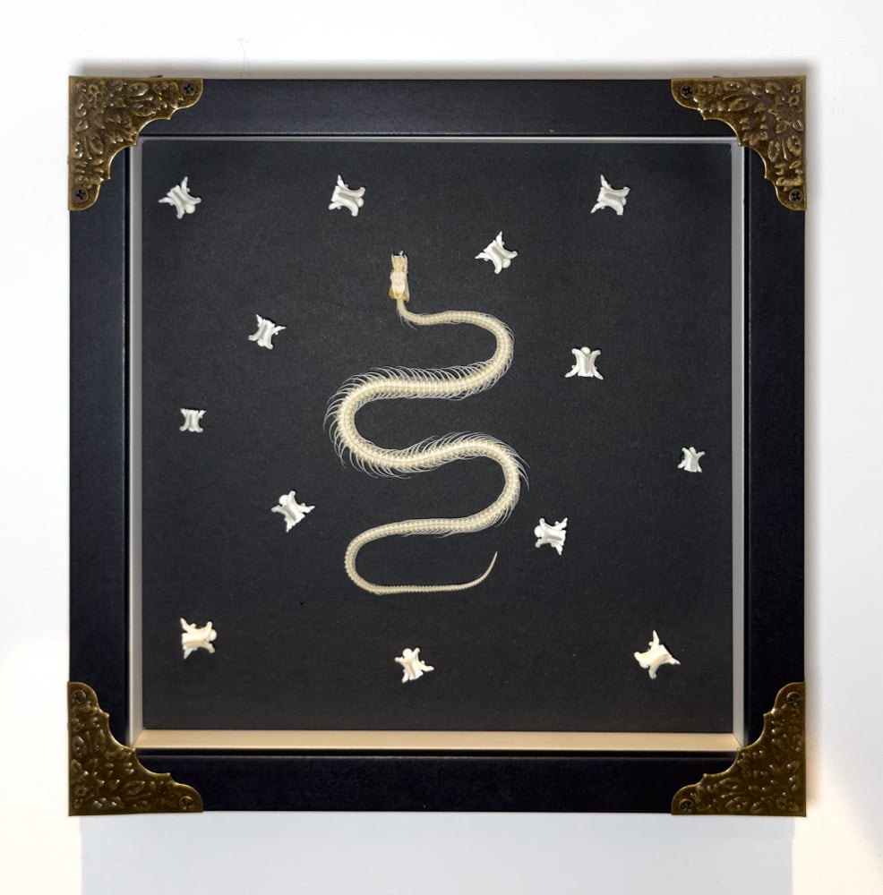 ✨Complete snake skeleton with snake vertebra on a black backing and black shadow frame with golden antique corner details✨